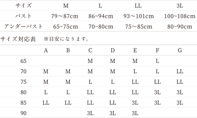 | アンダーバスト | 65~75cm | 70~80cm | 75~85cm | 80~90cm |